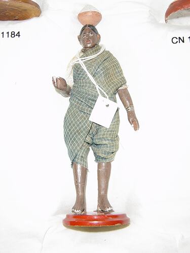 Figure of a woman on a wooden base. The base is painted red turned wood. A paper label is glued to the base. The figure is plaster/composition modeled over wooden dowels, it is painted with a dark brown skin tone and dressed in fabric. Her garments consist of white cotton blouse and a blue and white checked cotton sari and she has a bundle on her head.