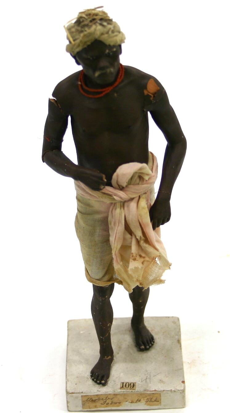 Figure of a man on a square base made from fired clay, painted white. Two paper labels are glued to the base. The man is fired clay modeled over ferrous metal armature, which attaches to the base. The figure is painted with a dark brown skin tone and is dressed in fabric. His garments consist of a white tunic and white loincloth. He wears a red necklace and a red arm band on his upper right arm. He has real hair on his face and chest.