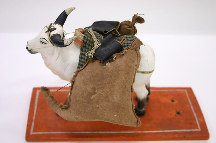 Figure of a laden bullock on an orange and white painted wooden base. The figure is made from a plaster/composition and is painted white with black horns, nose, hooves and eyes. The bullock has a dark and light blue checked textile saddle and two panniers of brown cotton. There are also three smaller bags of cotton - two blue and one brown - attached to the bullock. A pad made from white and red cotton sits under the bullock's hump. There are two holes in the base behind the bull; this is where the driver figure would have stood.