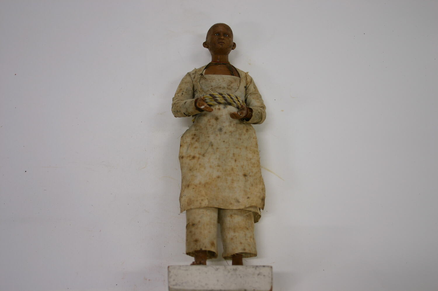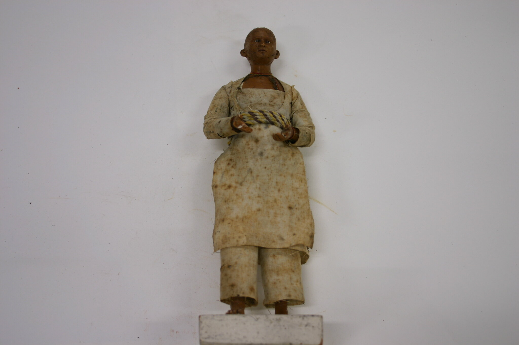 Figure of a man on a square base made from fired clay, painted white. The man is fired clay modeled over ferrous metal armature, which attaches to the base. The figure is painted with a medium brown skin tone and is wearing white shirt, coat and trousers, with a twisted brown and yellow rope belt.