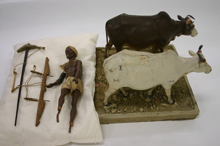 Model of two bulls, on a rectangular wooden and clay base. A paper label is glued to the white bull.The bulls are made from fired clay modelled over ferrous metal armature, which attaches to the base. One bull is painted brown, with black hooves and horns and a white face. The other bull is painted white, with grey hooves, horns and nose, it also has several symbols on its hind quarters. There was originally a man attached to the base and the bulls were yoked to a plough. The plough and the man's staff are both made of wood and string. The man is fired clay modelled over ferrous metal armature. The figure is painted with a dark brown skin tone and is dressed in fabric. He is wearing a white cotton loincloth and turban and has real facial and chest hair.
