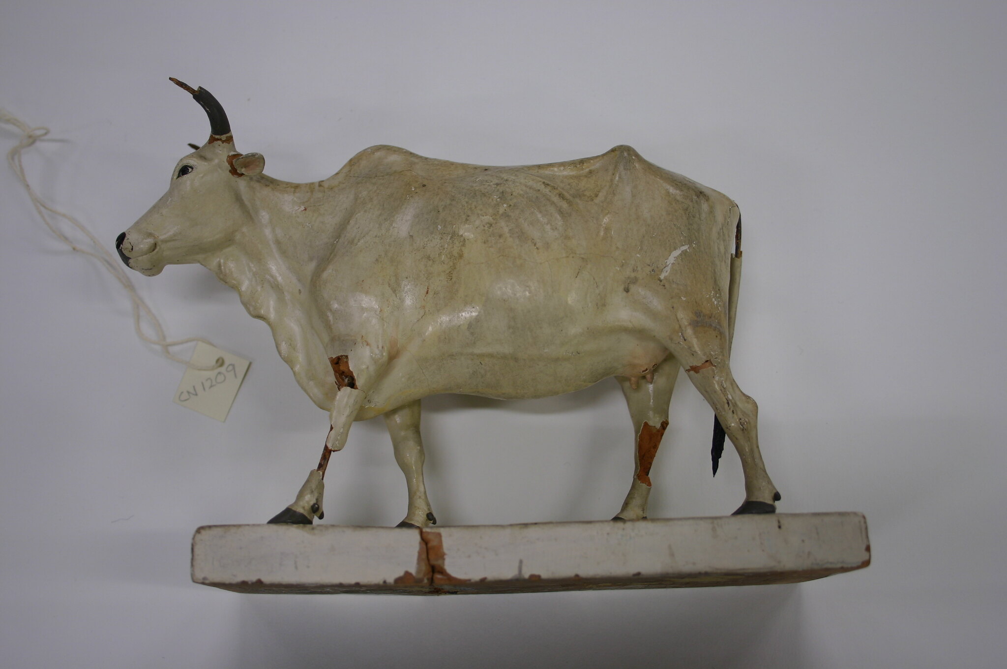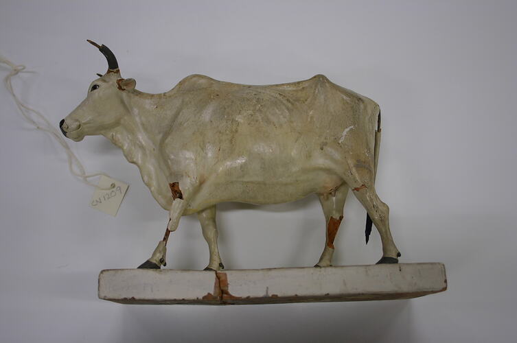 This clay figure of a sacred cow was made in Krishnanagar province, India, by Jadunath Pal. It was exhibited at the Melbourne International Exhibition in 1880, as part of a group of figures representing various castes, occupations and religious sects in India. This group was awarded a Second Order of Merit and was exhibited as part of the British India Court. It was gifted to the National Gallery of Victoria (NGV) by the India Commission of the Melbourne International Exhibition, 1880-81. The NGV Stock book records identify this figure as 'A Sacred Cow'.