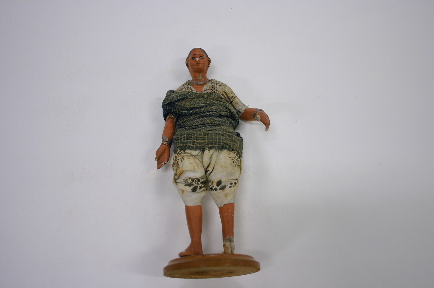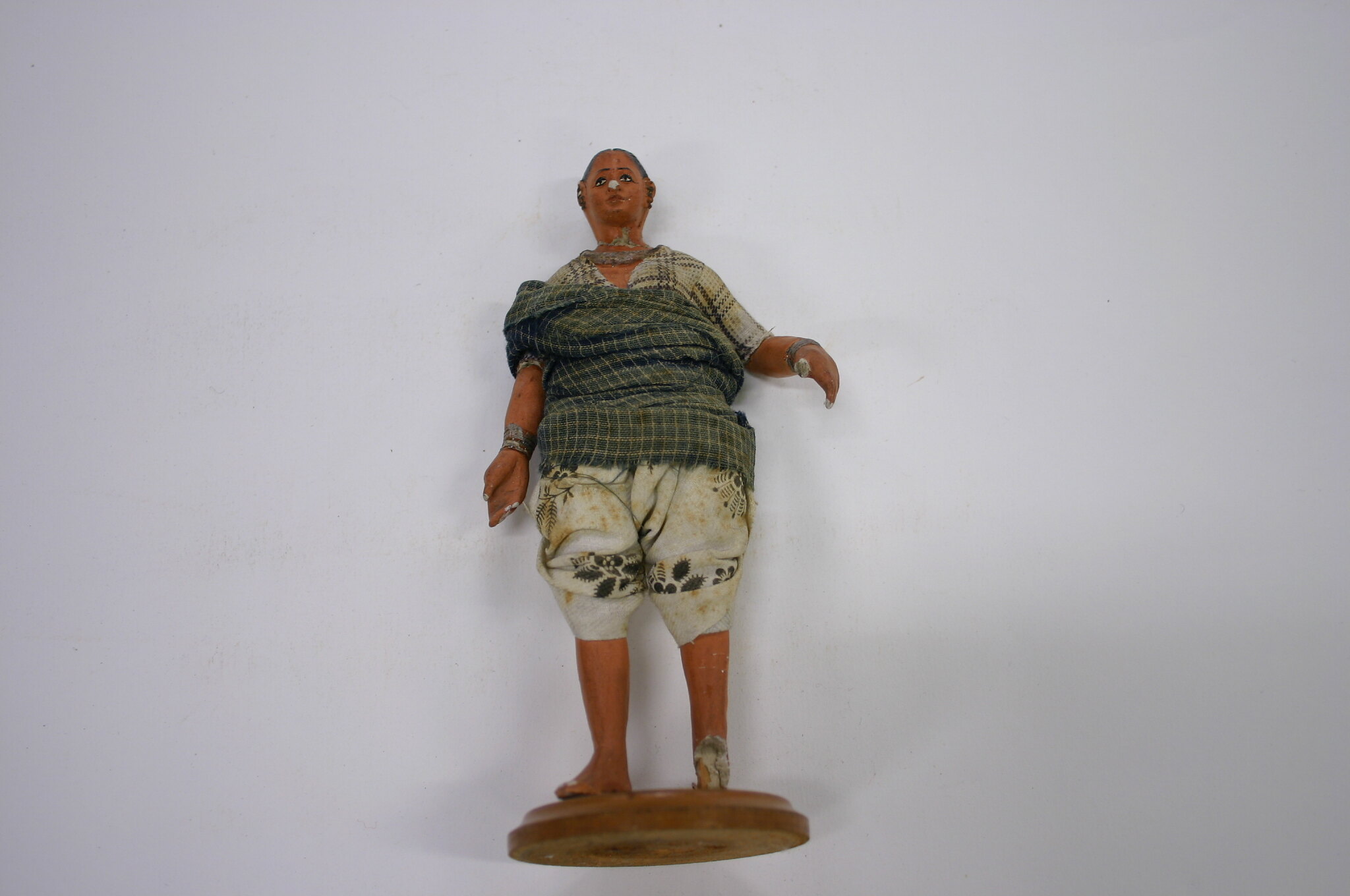 Figure of a woman on a wooden base. The base is painted brown turned wood. A paper label is glued to the base. The figure is plaster/composition modeled over wooden dowels, it is painted with a terracotta skin tone and dressed in fabric. Her garments consist of a blouse and trousers of white and black cotton, the blouse has a checked design, the trousers have a floral design. She also has blue, checked shawl wrapped around her waist.
