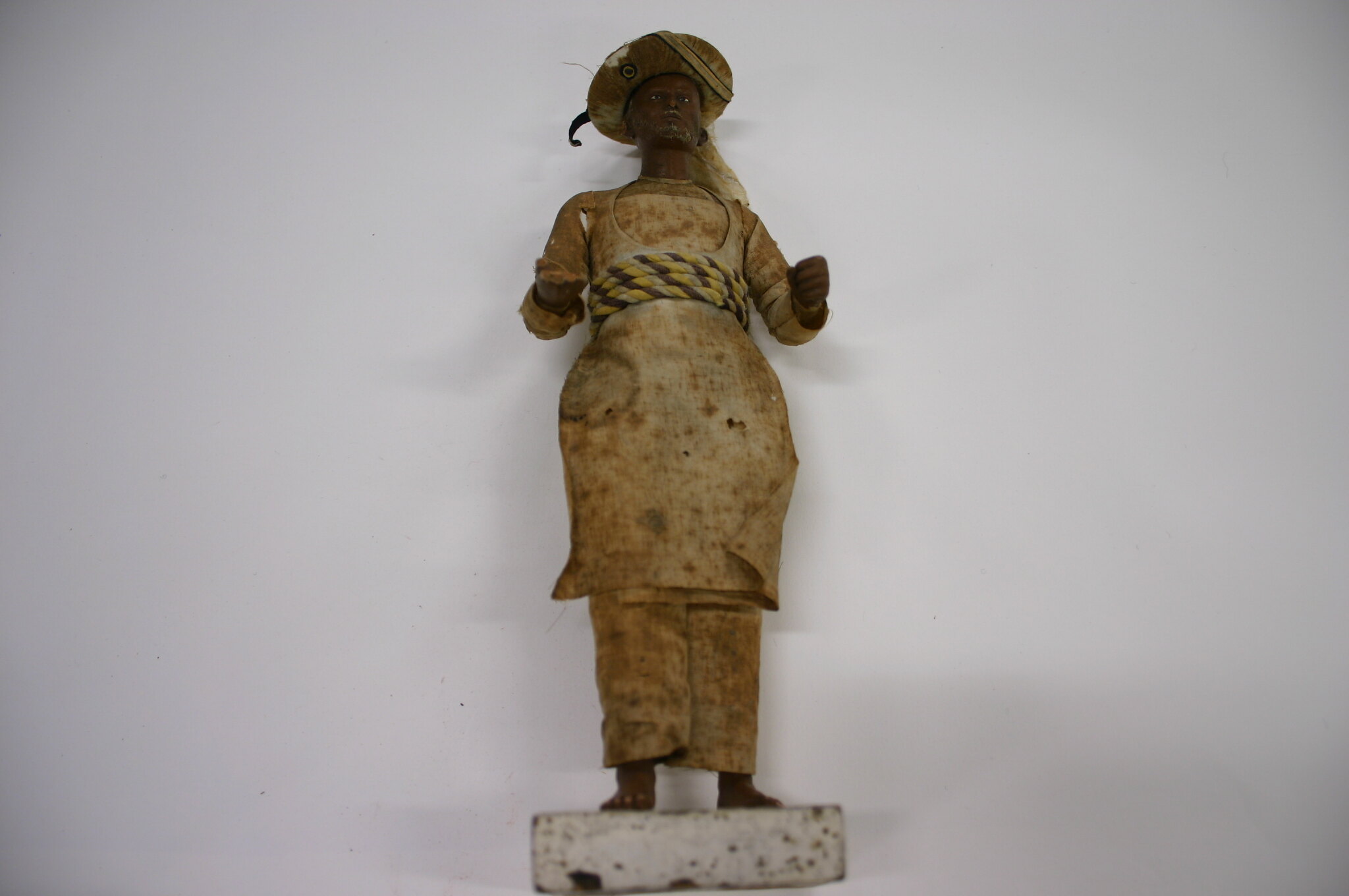 Figure of a man on a square base made from fired clay, painted white. The number 3 printed in black ink is written on the base. The man is fired clay modeled over ferrous metal armature, which attaches to the base. The figure is painted with a medium brown skin tone and is wearing a white pants, shirt and coat, with a twisted brown belt and is wearing a white broad brimmed hat. The object is in damaged, dirty and cracked and the textiles are dirty faded and insect damaged.