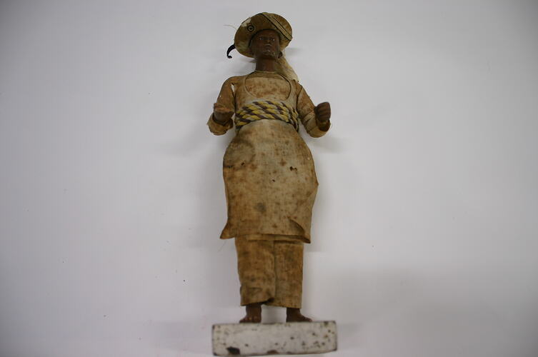 This figure of a man wearing a brown and yellow belt was made in Krishnanagar province, India. It was exhibited at the Melbourne International Exhibition in 1880, as part of a group of figures, representing various castes, occupations and religious sects in India. It was gifted to the National Gallery by the India Commission of the Melbourne 1880 International Exhibition.