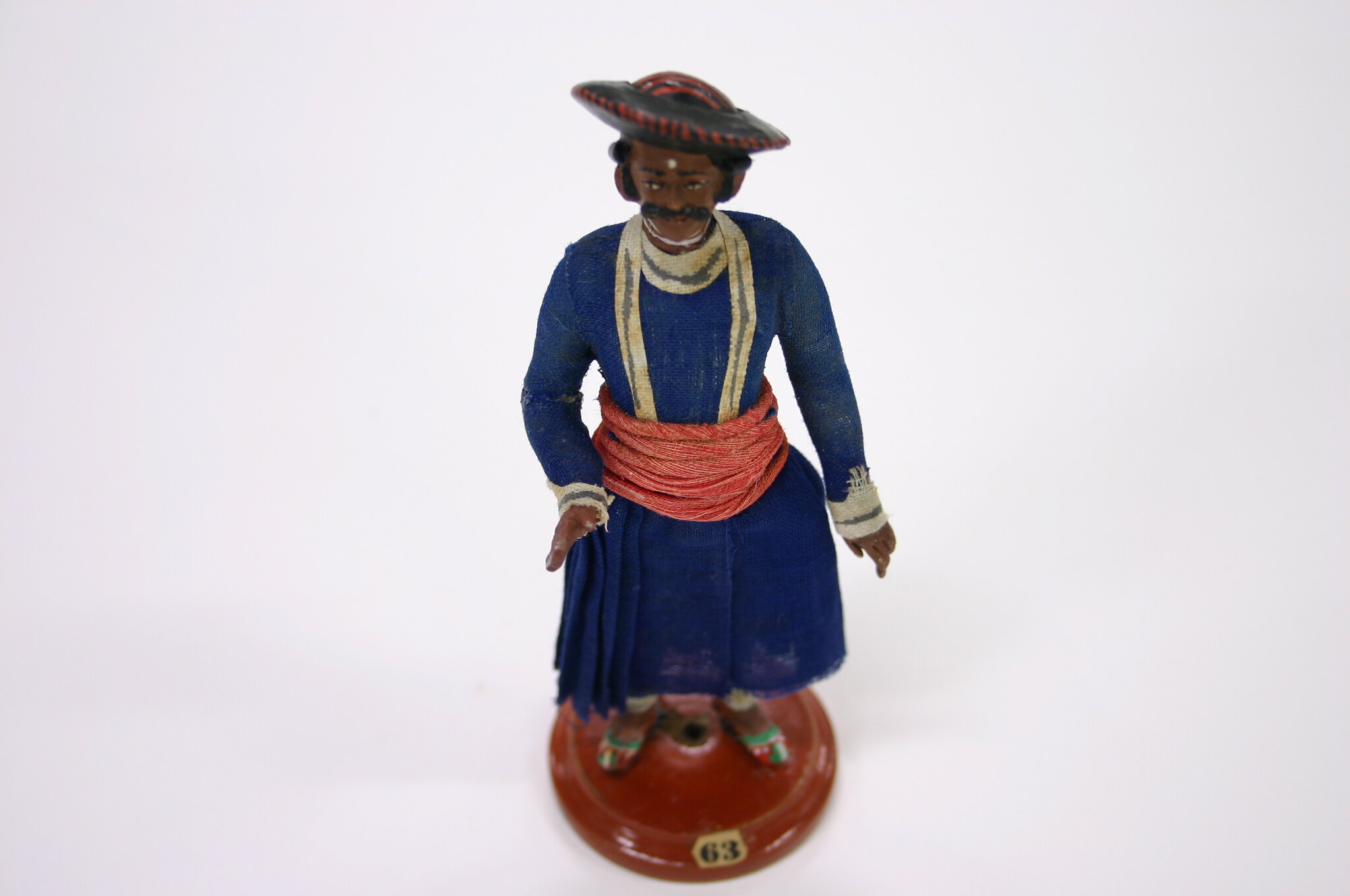 Figure of a man on a wooden base. The base is painted brown turned wood. A paper label is glued to the edge of the base. The figure is plaster/composition modeled over wooden dowels, it is painted with a dark brown skin tone and is dressed in fabric. His garments consist of a blue tunic with a red sash around his waist, an underskirt of white with brown spots and white leggings. He wears a painted black and red hat and green, white and red pointed toe shoes.