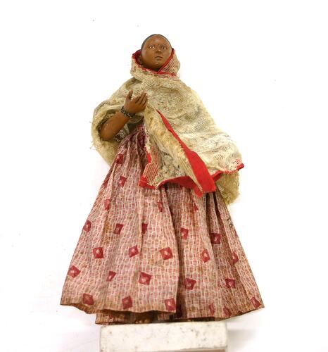 Figure of a woman on a square base made from fired clay, painted white. The woman is fired clay modelled over ferrous metal armature, which attaches to the base. The figure is painted with a dark brown skin tone and is dressed in fabric. Her garments consist of a white and red cotton skirt and a white lace shawl with red trim.