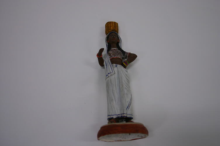 Figure of a woman on a round base made from fired clay, brown and white. A paper label is glued to the upper surface of the base and the underside of the base. The woman is fired clay modelled over a ferrous metal armature, which attaches to the base. The figure is painted with a dark brown skin tone and is wearing a white skirt with blue trim, blue and white top, a white shawl with blue trim over her hand and shoulders, green, red and yellow bracelets and is carrying a brown basket on her head.