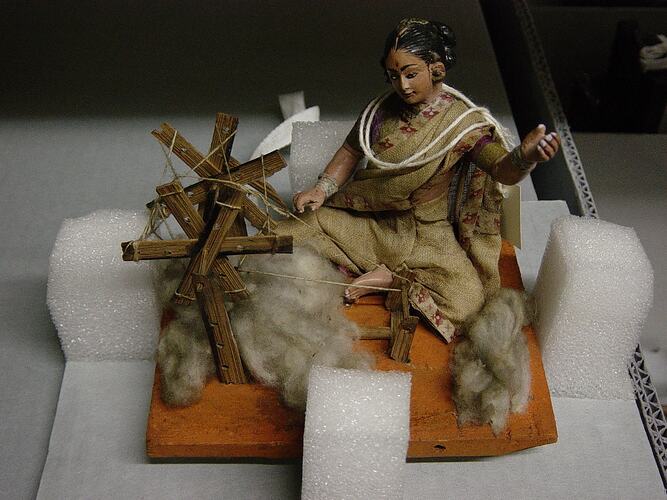 This clay figure of a woman spinning yarn on a floor charkha was part of a series of 82 Indian clay figures purchased from Stubb and Co for £9.10 in 1867 by the National Gallery of Victoria (NGV). The group of figures, which came from Pune (Poona), represented various castes, occupations and religious sects in India. The NGV Stock book records identify the figure as a 'Cord Maker (in the act of Spinning)'.