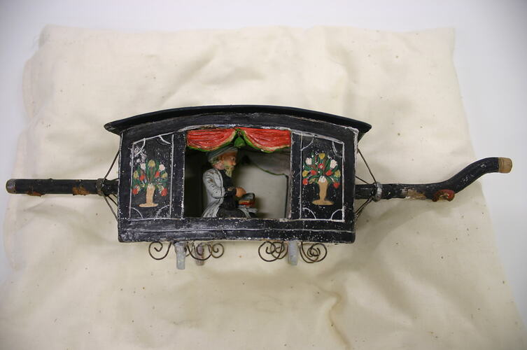 A Palanquin with a man seated inside. The palanquin and man are made from fired clay modelled over ferrous metal armature. A paper label is glued to the top of the Palanquin. The Palanquin has carrying poles attached and decorative metalwork on the underneath and at the ends. It is painted black with two vases of flowers in red, yellow and green on each side of the palanquin, there is also a folded back red and green curtain on each side. The figure is seated cross legged, has a fair skin tone, blond hair and is dressed in white tunic and turban, and black pants and is holding a red object in his hands.