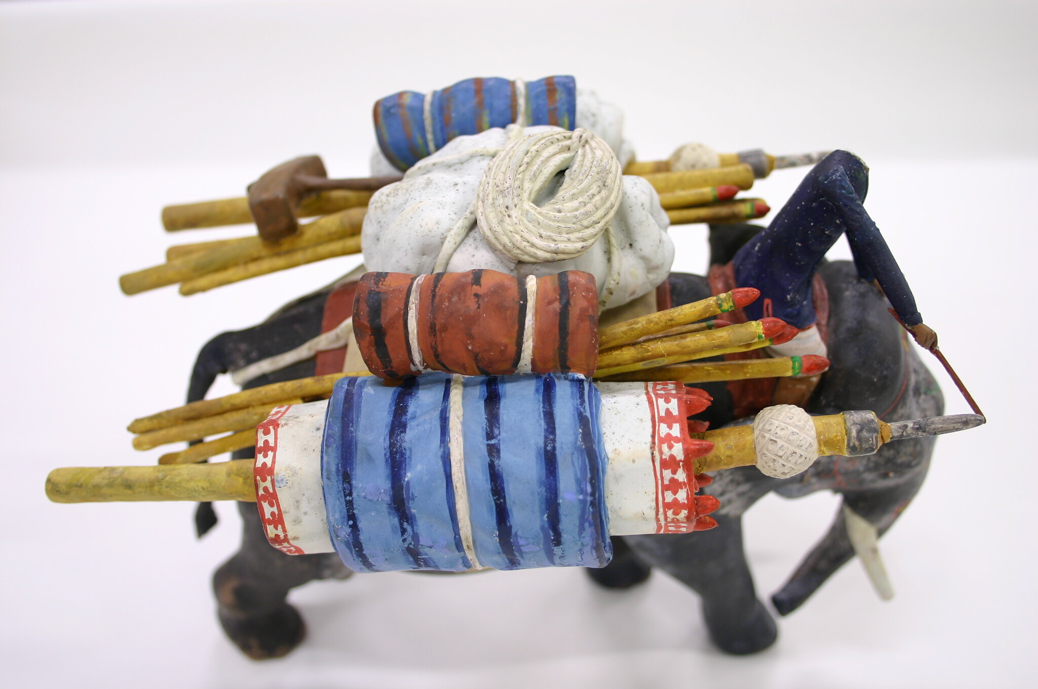Figure of an elephant, with a load and rider on its back, on a base of fired painted clay. There are two small paper labels glued to both sides of the elephant. The elephant is fired clay, painted grey with decorative markings on its face and trunk. It is modelled over ferrous metal armature. The burden on the elephant's back consists of poles and rolled up textile, the poles have been broken and the metal armatures are bent.