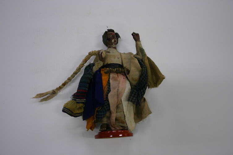 Figure of a man on a turned wooden base. The base is painted red. The figure is plaster/composition modeled over wooden dowels, it is painted with a dark brown skin tone and dressed in fabric. His garments consist of a white cotton coat, he has a number of strips of multicoloured cotton around his arms and waist, and is wearing a black belt with small gold balls around it. He is holding some twisted textile in his right hand.