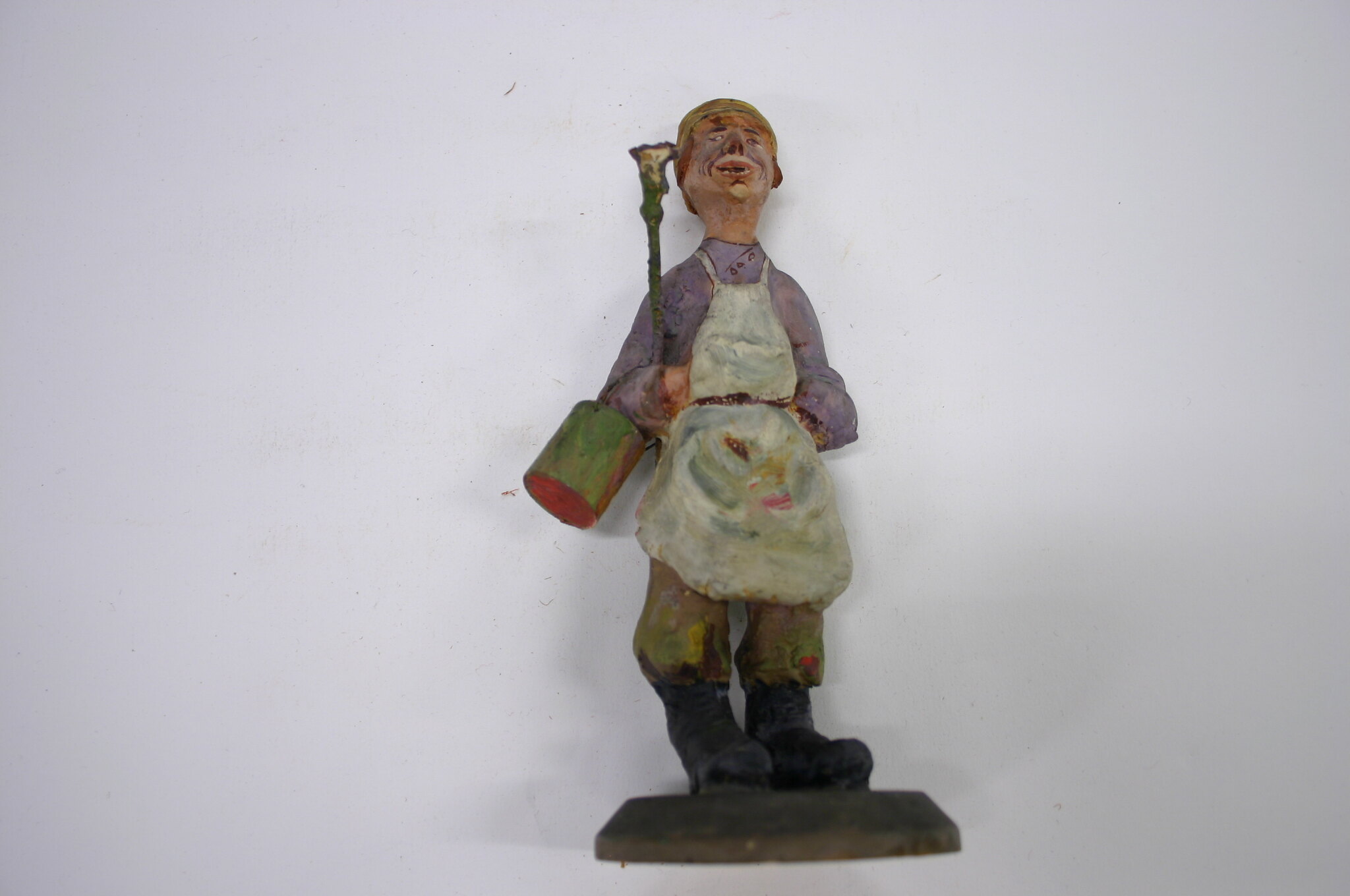 Figure of a tradesman, a painter, from Russia, on a base of turned wood painted grey and orange. The figure is painted wood wearing black boots, green pants, a purple shirt, white apron and yellow hat, he is holding a green bucket in his right hand and a long pole under his right arm.