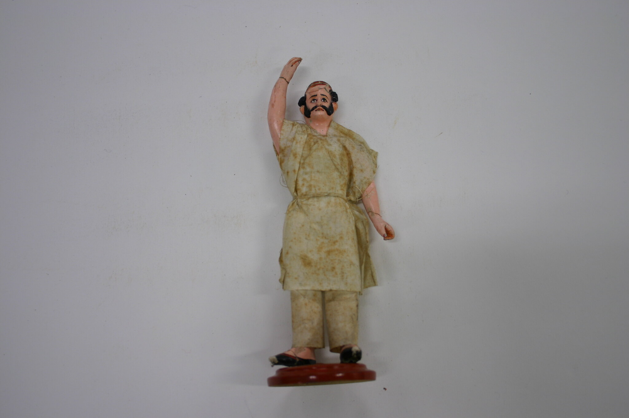 Figure of a man on a wooden base. The base is painted red turned wood. The figure is plaster/composition modeled over wooden dowels, it is painted with a fair skin tone and dressed in fabric. His garments consist of a painted red hat, white tunic, white trousers, and painted black shoes.