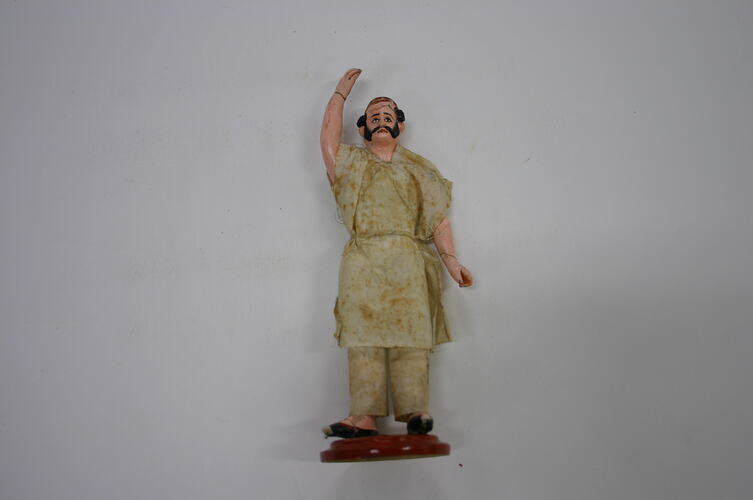 This clay figure of a Parsi servant was made in Pune in India in the latter half of the nineteenth century. It was exhibited as part of a group of figures representing various castes, occupations and religious sects. Such figures were exhibited at International Exhibitions and often won awards. This figure was accessioned by the National Gallery of Victoria (NGV) in 1867 as a purchase from Stubb and Co.