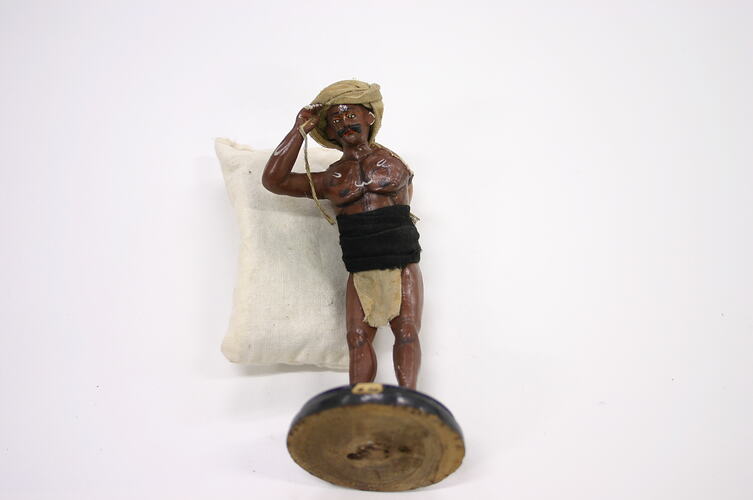 Figure of a man on a wooden base. The base is turned wood painted black. A paper label is glued to the upper surface of the base. The man is plaster/composition modeled over wooden dowels, which are attached to the base,through his legs. He is painted with a dark brown skin tone and dressed in fabric. He is dressed in a white cotton turban and loincloth, a black cotton waist sash and is holding a white cotton rope in his left hand. He is carrying a water bottle made from plaster/composition on his shoulders, which is fixed to his back by a ferrous metal pin passing from the bottle to his back. He also has several white u-shaped symbols painted on his arms and torso.