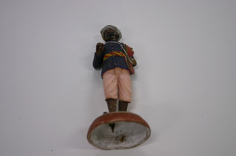 Figure of a man on a round base made from fired clay, painted brown. A paper label is glued to the base. The man is fired clay modeled over a ferrous metal armature, which attaches to the base. The figure is painted with a dark brown skin tone and is wearing a white hat, a blue jacket, a red and yellow sash and pink pants. He also has a white sash over his right shoulder and red and green one over his left.