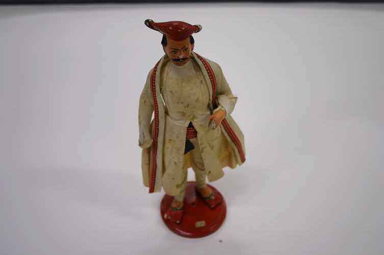 Figure of a man on a wooden base. The base is painted red turned wood. A paper label is glued to the base. The figure is plaster/composition modeled over wooden dowels, it is painted with a terracotta skin tone and is dressed in fabric. His garments consist of white shirt, coat and trousers, all with red and black trim, and painted red hat and shoes.