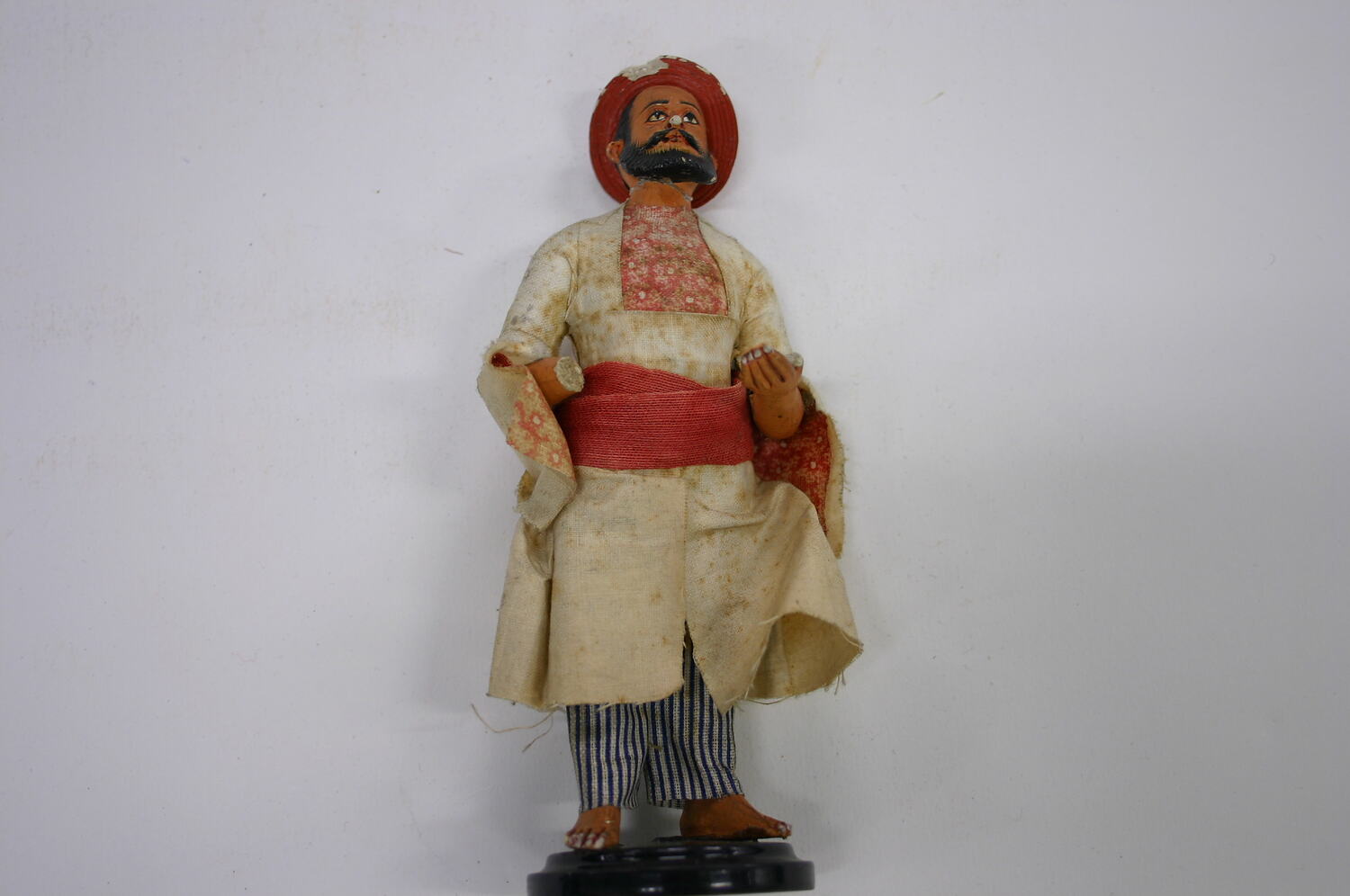 Figure of a man on a wooden base. The base is painted, black turned wood. The figure is plaster/composition modeled over wooden dowels, it is painted with a terracotta skin tone and dressed in fabric. His garments consist of a painted red hat, a white coat with pink and yellow detailing on the inside of the sleeves and the bodice, a red waist sash, and blue and white stripped trousers.
