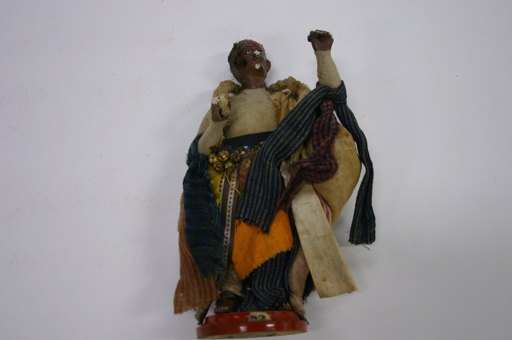 Figure of a man on a turned wooden base. The base is painted red. There is a paper label glued to the upper surface of the base. The figure is plaster/composition modeled over wooden dowels, it is painted with a dark brown skin tone and dressed in fabric. His garments consist of a white cotton coat, he has a number of strips of multicoloured cotton around his arms and waist and is wearing a black belt with small gold balls around it. He is holding some twisted textile in his right hand, which passes around his neck and lies on his chest.