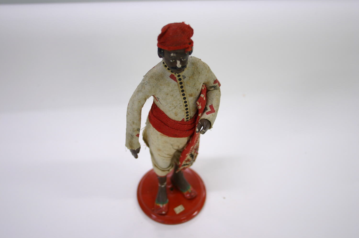 Figure of a man on a wooden base. The base is painted red turned wood. A paper label is glued to the base. The figure is plaster/composition modeled over wooden dowels, it is painted with a dark brown skin tone and is dressed in fabric. His garments consist of a red hat, a white, red and black patterned top and sash, and white trousers. He is holding a piece of red, white and black patterned fabric close to the left side of his body.
