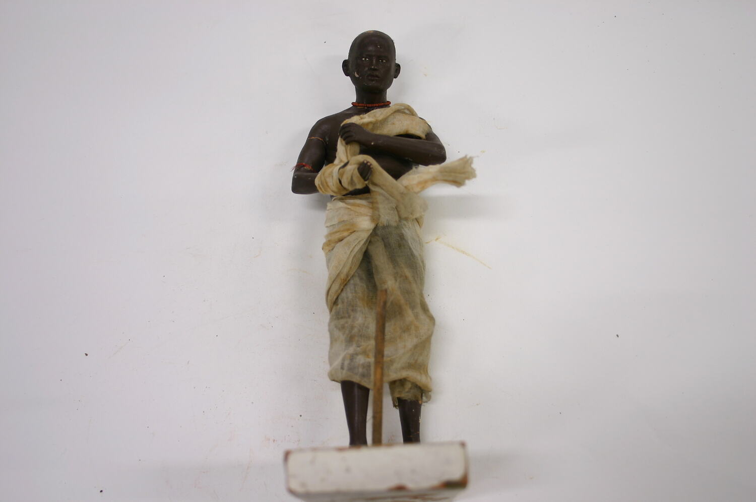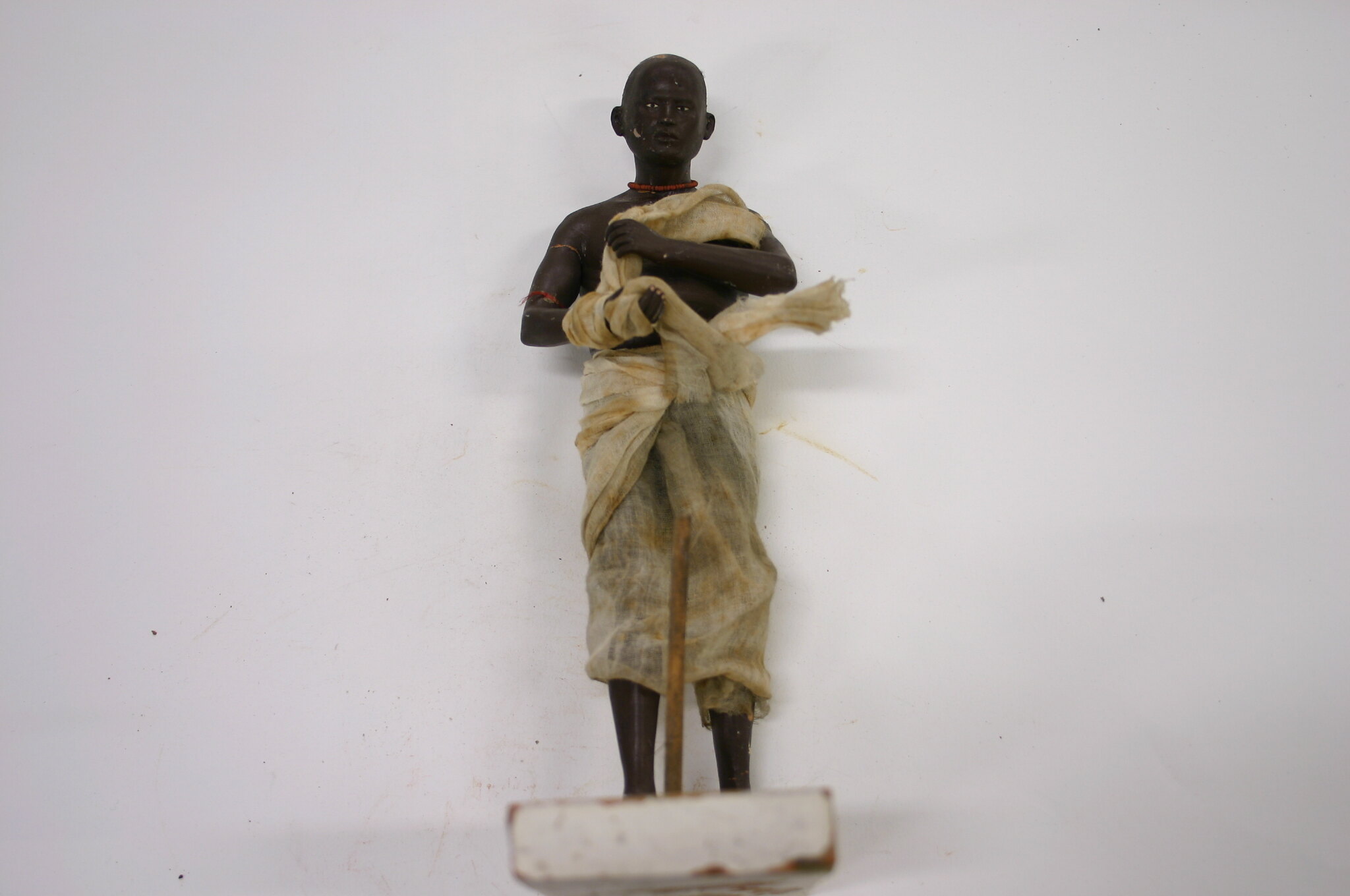 Figure of a man on a square base made from fired clay, painted white. The man is fired clay modeled over ferrous metal armature, which attaches to the base. The figure is painted with a dark brown skin tone and is dressed in fabric. He is wearing a red necklace and a red arm band on his right upper arm, and a white skirt. He is holding a piece of white cotton in his right hand, and there is a wooden rod attached to the base in an upright position in front of the figure, which has been partially snapped off.