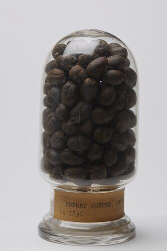 Coffee fruit sample in domed glass jar with label.