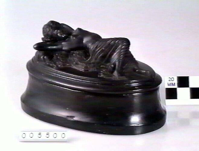 Oval shaped decorative coal box with female figure reclining on lid, partially clad in drapery.