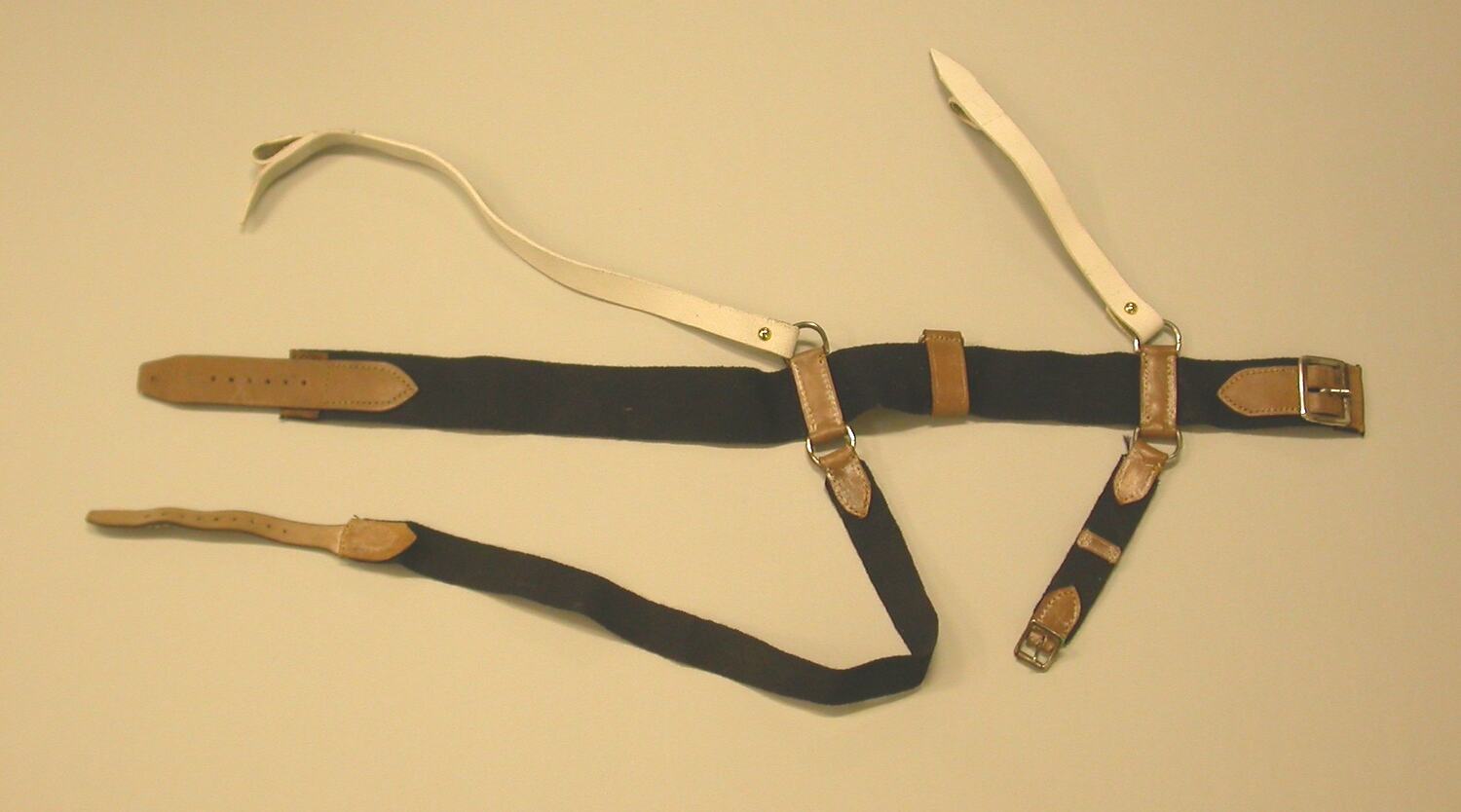 Navy blue cotton twill sword belt with light brown leather and metal fastenings. White painted buff leather slings to attach to sword with brass buttons.
