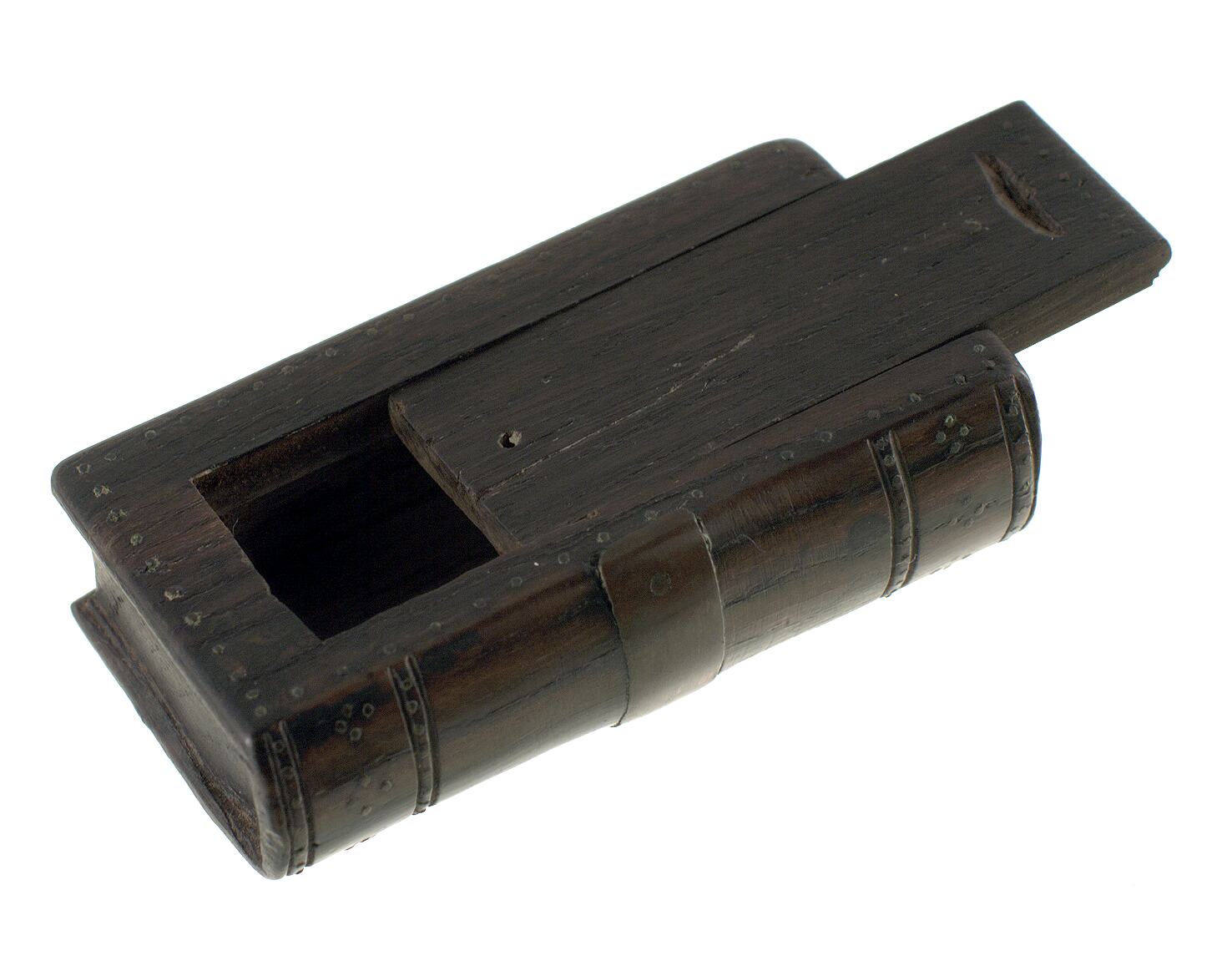 Snuff box made in the shape of a book with a sliding lid. The surface is decorate with metal rivetts and a copper band on the 'spine'.