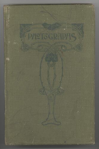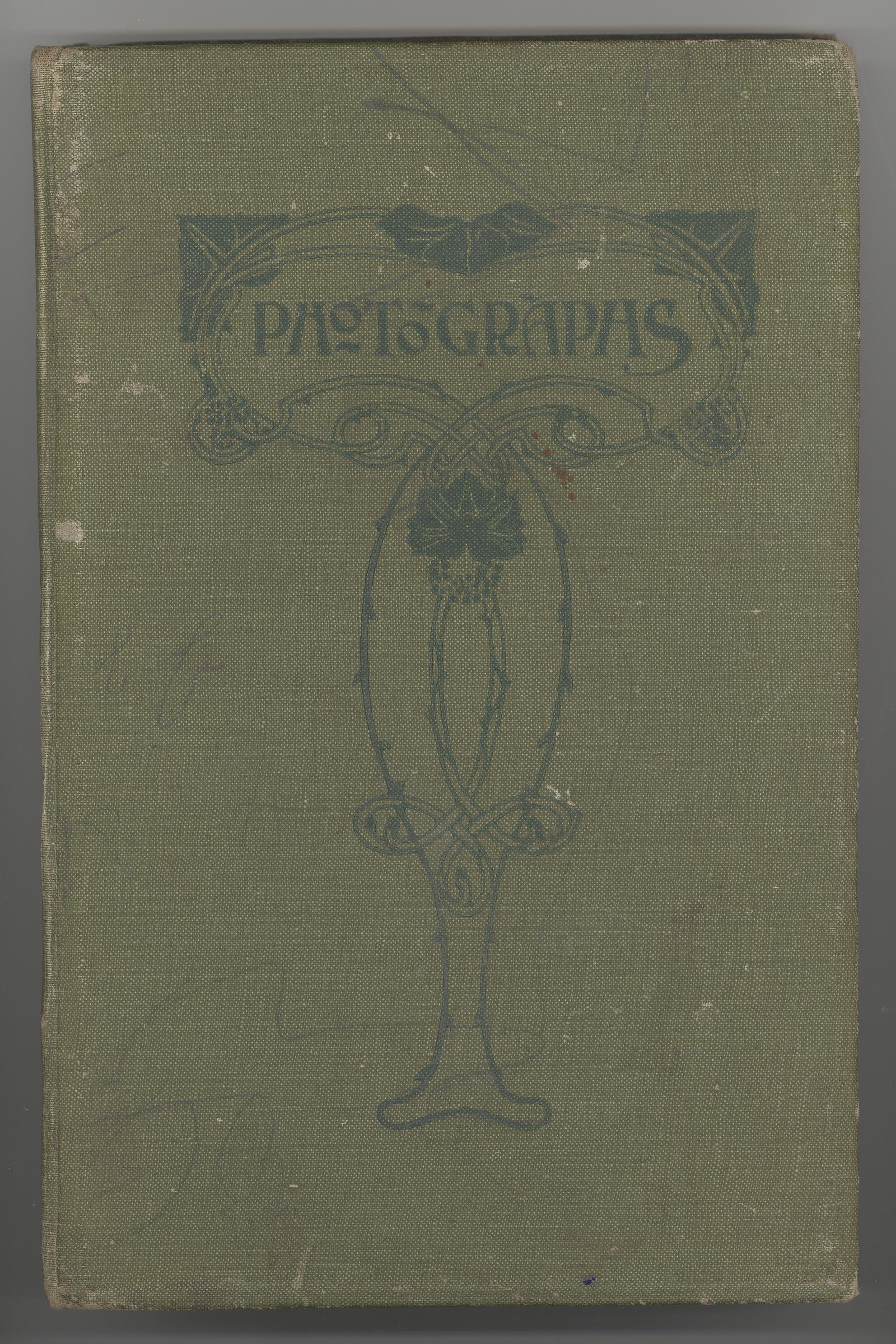 A green cloth-covered photograph album, decorated on front with Art Nouveau style flourish and the words 'Photographs'. Contains black and white photographs.