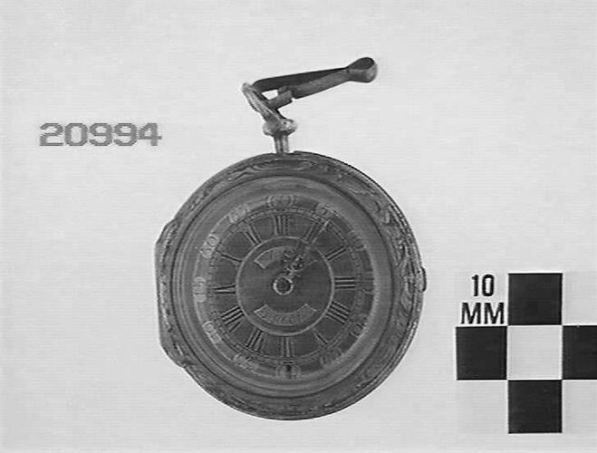 Metal pair case. Outer case is marked with human figures and angel in high relief. Dial has outer ring of arabic numerals for minutes and inner ring of roman numerals for hours and gilt hands. Key wound spring; verge escapement. Fusee and chain.