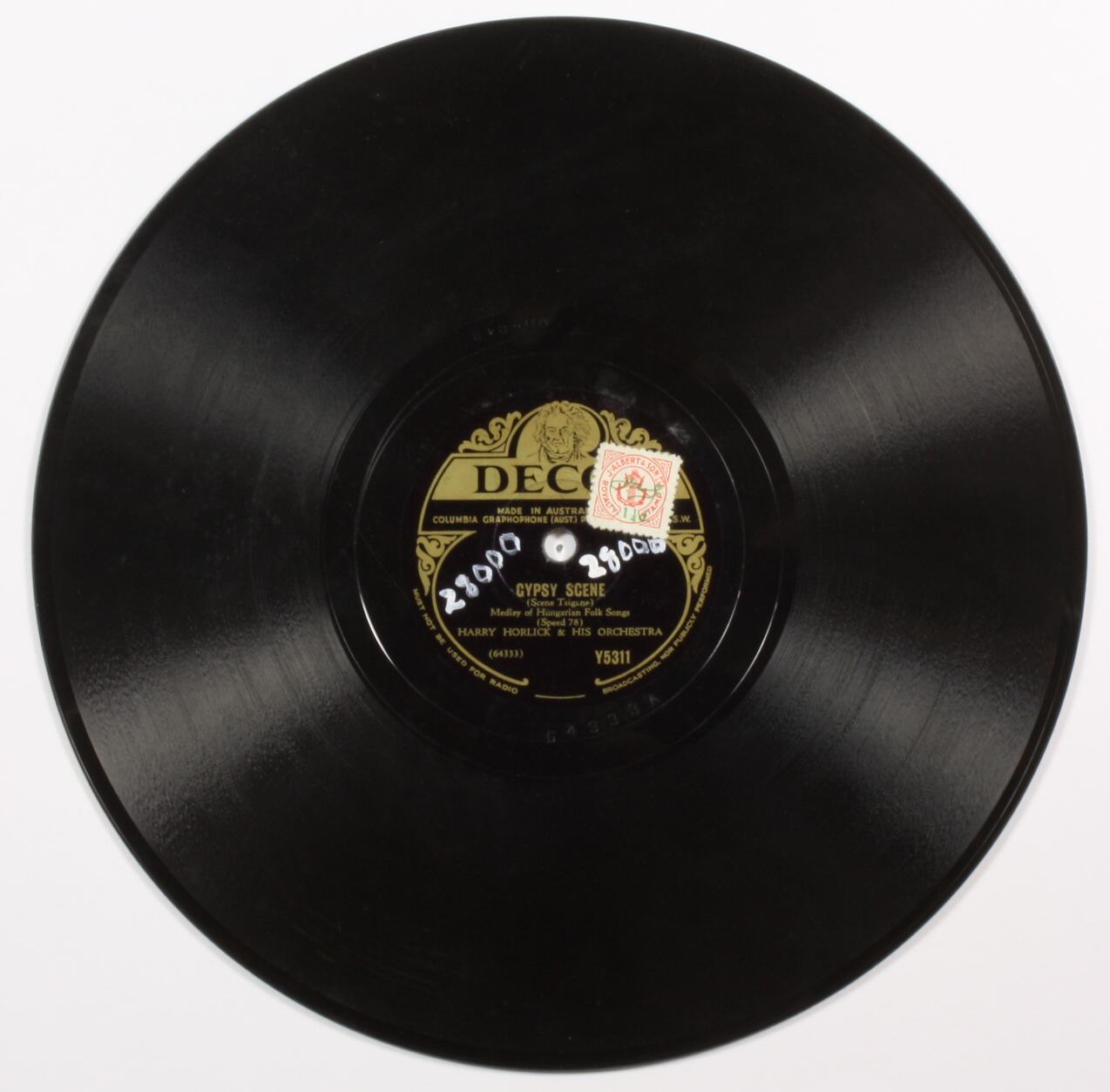 Side A: (logo) DECCA / MADE IN AUSTRALIA / COLUMBIA GRAPHOPHONE (AUST.) PTY LTD. Sydney N.S.W. / HUNGARIAN SCENE / Scene Hongroise / Speed 78 / HARRY HORLICK & HIS ORCHESTRA / 64335 / Y5311 Side A (run-out) 64335A Side B: (logo) DECCA / MADE IN AUSTRALIA / COLUMBIA GRAPHOPHONE (AUST.) PTY LTD. Sydney N.S.W. / GYPSY SCENE / Scene Tsgane / Medley of Hugarian Folk Songs / Speed 78 / HARRY HORLICK & HIS ORCHESTRA / 64333 / Y5311 Side B (run-out) 64333A