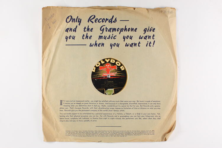 Side A: POLYDOR / Registered Trade Mark / POLYDOR / Made in Australia / In Italian / Soprano / LA BOHEME / Mi chianano Mimi / Saprano, Paris, with Orchestra / XENIA BELMAS / Soprano, Paris, with Orchestra / (Puccini) / Cat. No. / 66631 / [sticker] / 1.24122 Side B: POLYDOR / Registered Trade Mark / POLYDOR / Made in Australia / In Italian / Soprano / LA BOHEME / Audio / (Puccini) / XENIA BELMAS / Soprano, Paris, with Orchestra / Cat. No. / 66631 / [sticker] / 1.24123 One Side Of Sleeve: Only Records (text and illustrations) Second Side of Sleeve: (text and illustrations)