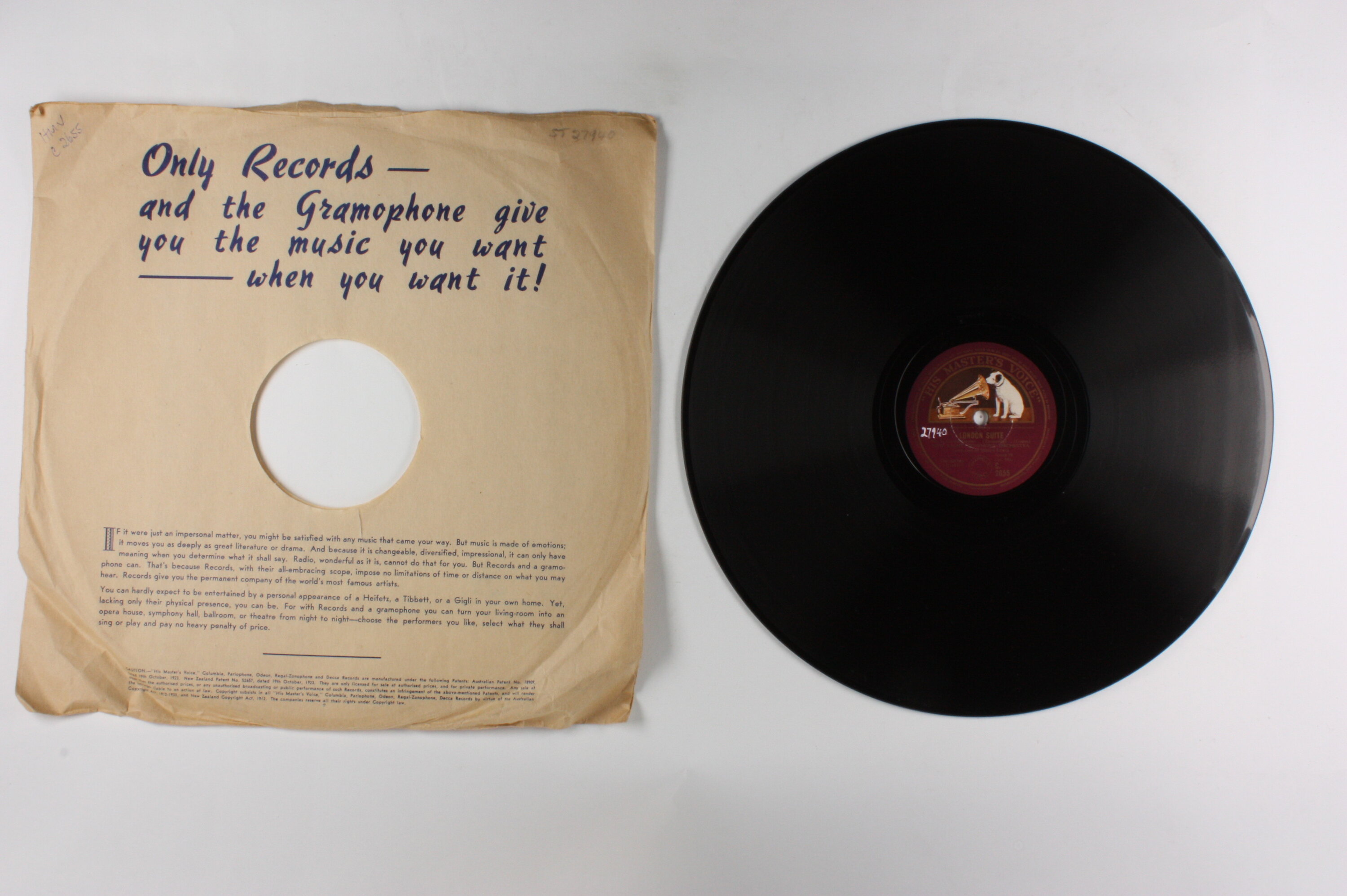 Side A: (text) / "HIS MASTER'S VOICE" / (illustration) / LONDON SUITE / No. 1-Covent Garden (Tarantelle) (Coates) / NEW LIGHT SYMPHONY ORCHESTRA / Conducted by Joseph Lewis / ORCHESTRA (32-4422) / (illustration) / Speed 78 Cat. No. C. 2655 / (text) Side B: (text) / "HIS MASTER'S VOICE" / (illustration) / LONDON SUITE / No. 2-Westminster (Meditation) (Coates) / NEW LIGHT SYMPHONY ORCHESTRA / Conducted by Joseph Lewis / ORCHESTRA (32-4423) / (illustration) / Speed 78 Cat. No. C. 2655 / (text) One side of sleeve: Only Record - and the Gramophone give / you the music you want / - when you want it! / (text) Second side of sleeve: (text)