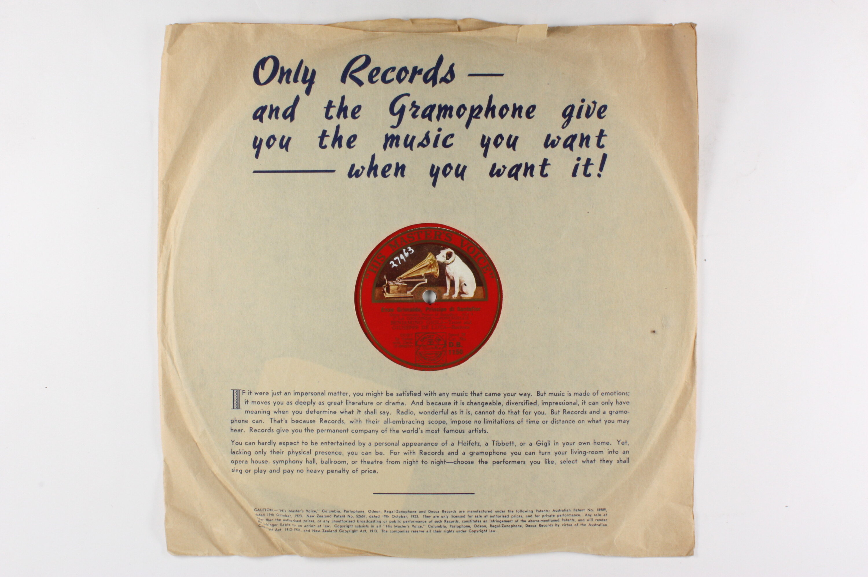 TYPE: HIS MASTER'S VOICE 12 IN. CONTENTS: "DELTEMPIO AL LIMITAR (IN THE DEPTHS OF THE TEMPLE)" FROM PEARL FISHERS (BIZET). "ENZO GRIMALDO, PRINCIPE DI SANTAFIOR (ENZO GRIMALDO, PRINCE OF SANTAFOR)". SUNG IN ITALIAN BY GIGLI, TENOR AND DE LUCA, BARITONE. COMPANY: TYPE DETAILS: DOUBLE SIDED. COMMENTS: CAT. NO. DB1150. MATRIX NOS. 2- 054208 & A41071, AND 2- 054211 & A41072.