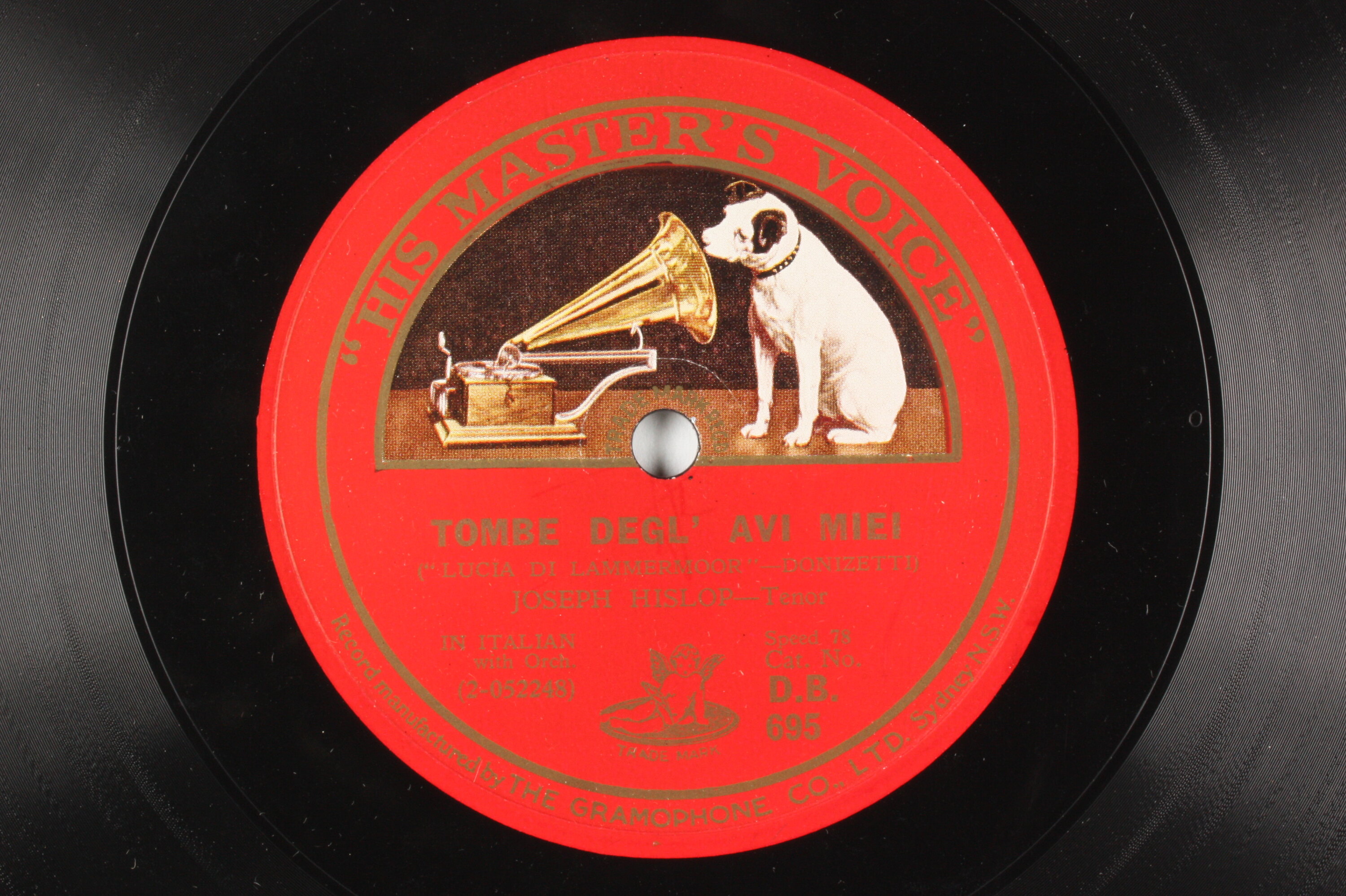 TYPE: HIS MASTER'S VOICE 12 IN. CONTENTS: "TOMBE DEGL'AVI MIEI (TOMB OF MY FATHERS)" AND "ARIA- FRA POCO A ME RICOVERO" FROM LUCIA DI LAMMERMOOR (DONIZETTI). SUNG IN ITALIAN BY J. HISLOP, TENOR. COMPANY: TYPE DETAILS: DOUBLE SIDED. COMMENTS: CAT. NO. DB695. MATRIX NOS. 2- 052248 & CC3372, AND 2- 052249 & CC3373. RECORDED IN LONDON CIRCA 1924.
