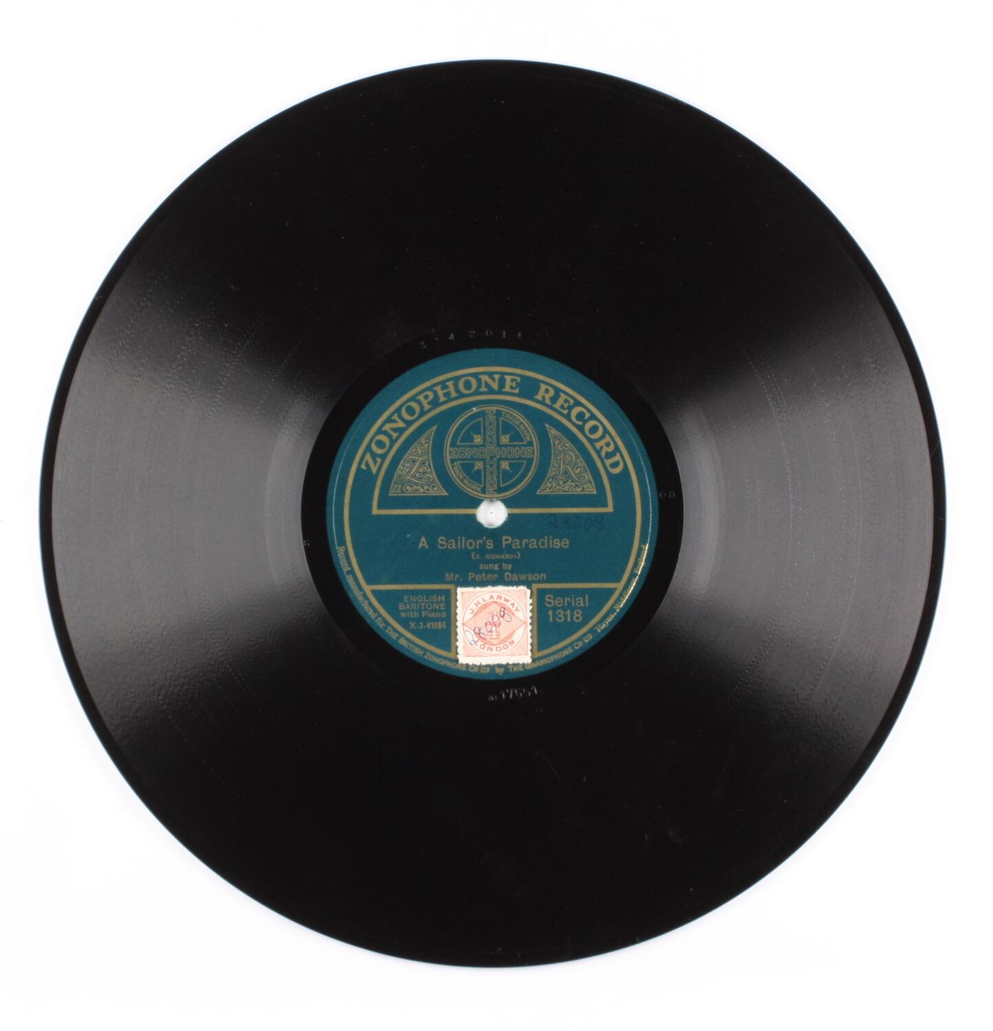 TYPE: ZONOPHONE 10 IN. CONTENTS: "SAILOR'S PARADISE" (RICHARDS) AND "IN AN OLD FASHIONED TOWN" (SQUIRE), SUNG BY PETER DAWSON WITH PIANO ACCOMPANIMENT. COMPANY: MADE IN LONDON. TYPE DETAILS: DOUBLE SIDED. COMMENTS: CAT. NO. 1318