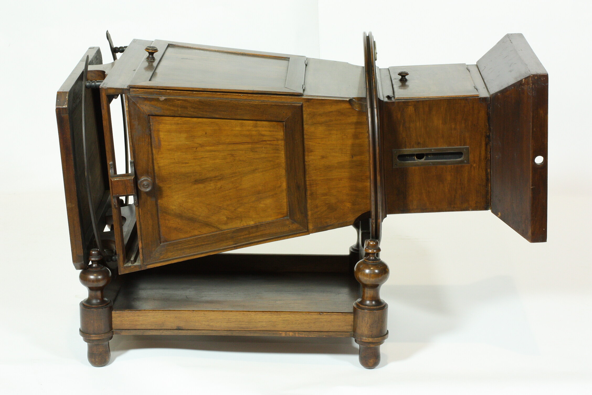 Polished wooden object with viewing aperture and large square lens in front, several hinged doors.