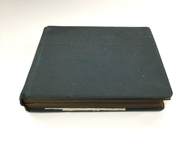 Photograph album, hard-cover with dark green cloth cover. Embossed front with letter 'S' and horizontal lines around. 86 pages (43 leaves), grey paper, torn away from cover. Images adhered along the edges with tape. Inscriptions written on album pages or backs of images.