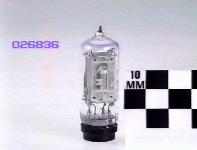 Tubular glass bulb on seven pin miniature glass button base with top exhaust tip. Pins fitted with pin protector. Valve is contained in rectangular buff coloured cardboard box with internal fibre packing.