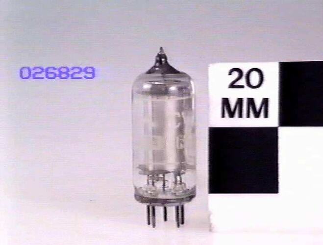 Tubular glass bulb on seven pin miniature glass button base with top exhaust tip. Valve is contained in rectangular buff coloured cardboard box with internal cardboard packing.