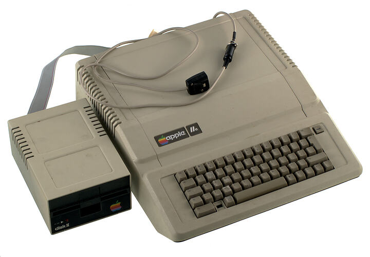 Apple IIe microprocessor computer system in beige plastic case attached by cord to disk drive. Other items include Owner's Manual 5¼" Floppy Disks, including DOS 3.3 System Master Pack Apple Logo Software Package II, 1982 Basic Programming Manuals Operating Manual Manuals - IBM Mother Board & Interface Card Connector Accessory Card) Memory Card