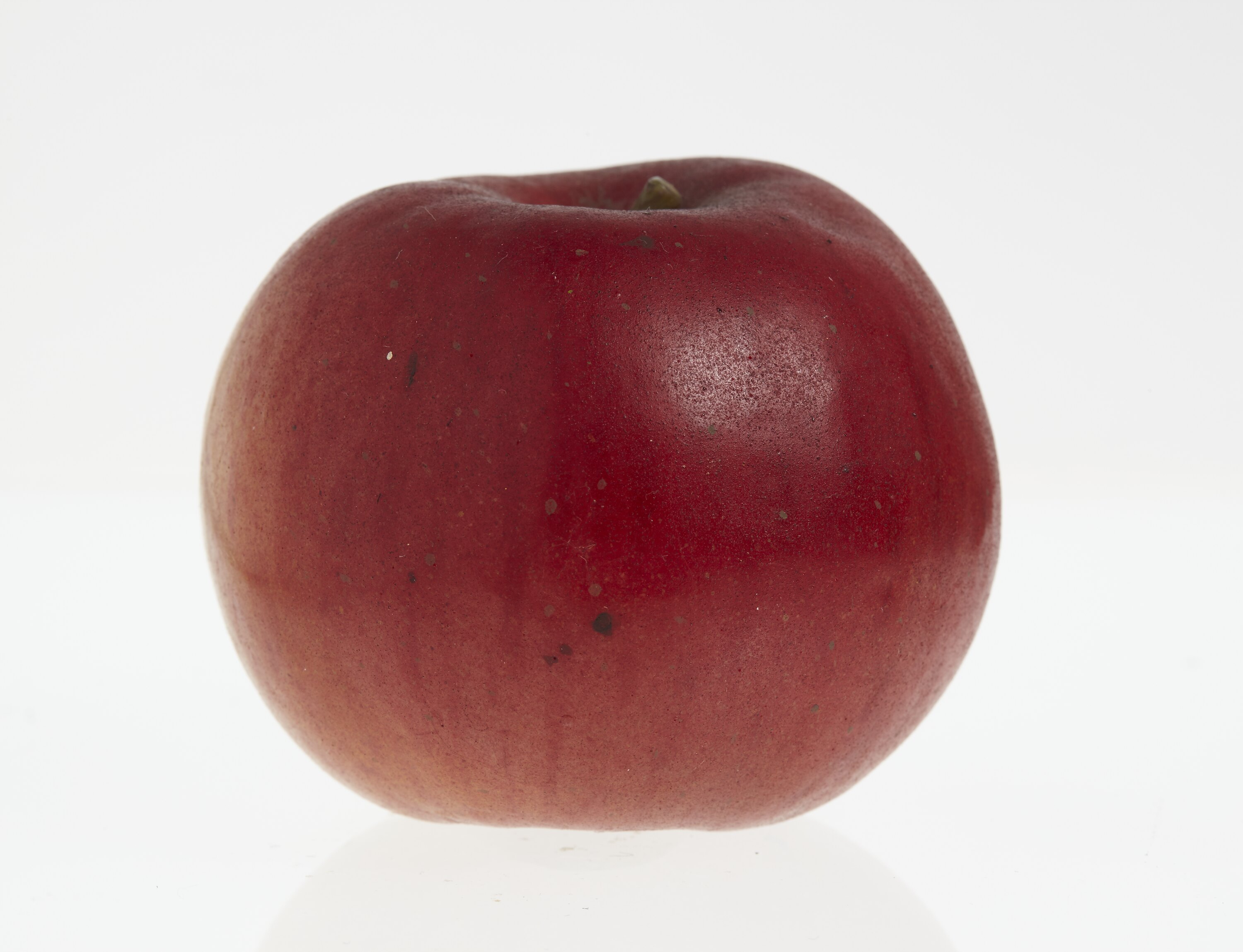 Wax model of an apple with a short stem, painted half red and half yellow.
