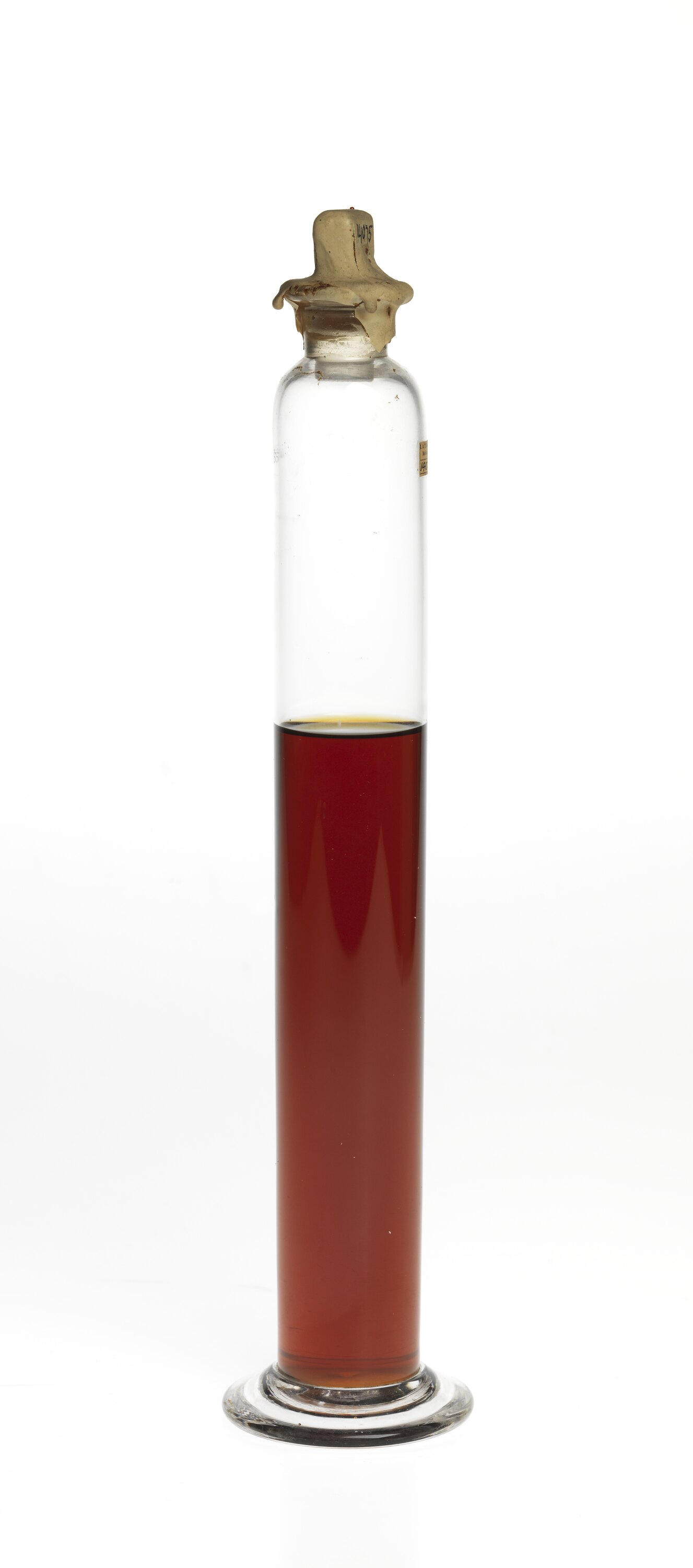 Oil sample in cylindrical glass jar with stopper and label.