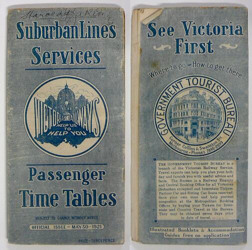 Passenger train timetable produced by Victorian Railways and the Victorian Government Tourist Bureau in 30 May 1921. The booklet provides arrival and departure times as well as other information relating to the Suburban Lines Services.