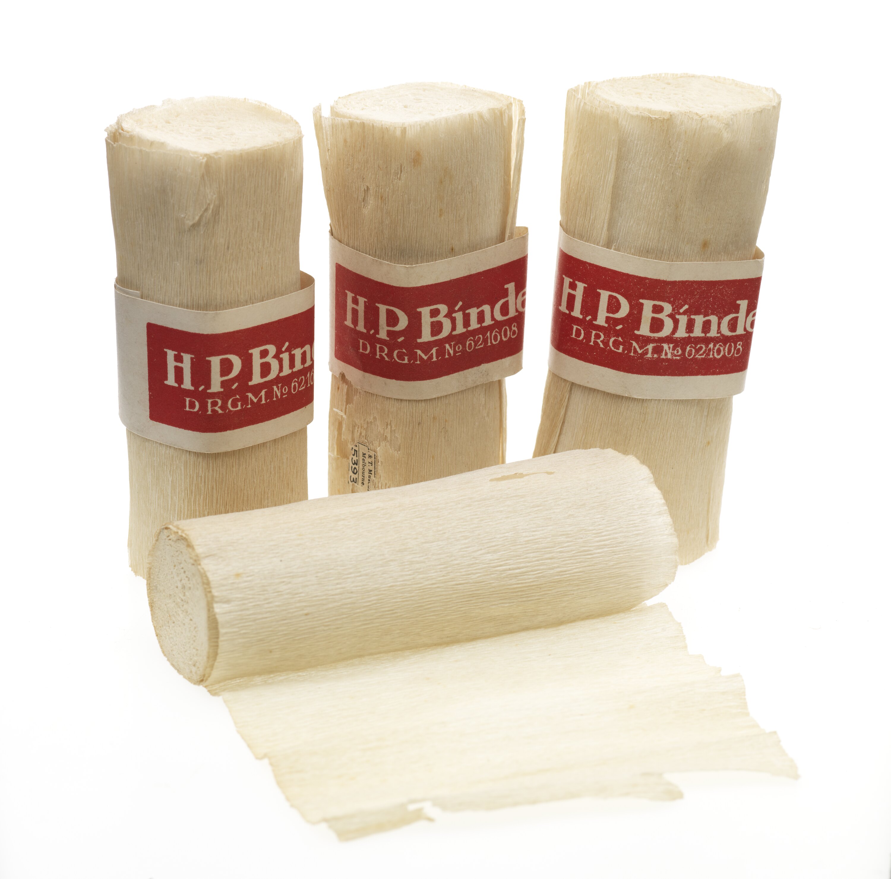 Collection of four surgical bandages made of crepe paper, labelled 'H.P. Binde' and 'D.R.G.M.' They are believed to have been made in Germany during World War I. 'Binde' translates as 'bandage', 'napkin' or 'ligature'. 'D.R.G.M.' stands for 'Deutsches Reichsgebrauchsmuster' - indicating a German state-registered design.