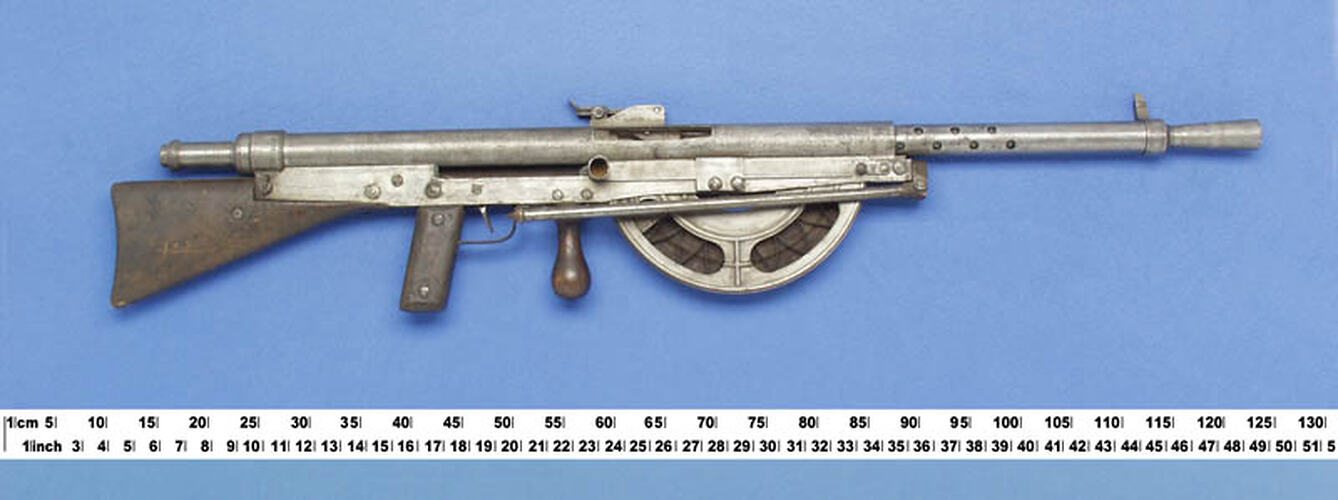 French Chauchat machine gun. Gas operated, sighted to 1300 yds. Magazine for 20 cartridges; takes French label cartridges. First used in the Great War.
