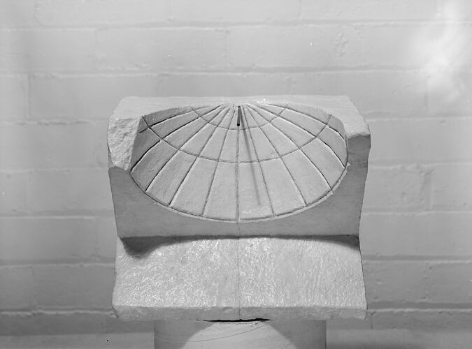 Waxed plaster cast of limestone sundial. Hemicycle type horizontal gnomon, 12 hours daylight shown by radial lines, seasons shown by 3 arcs.