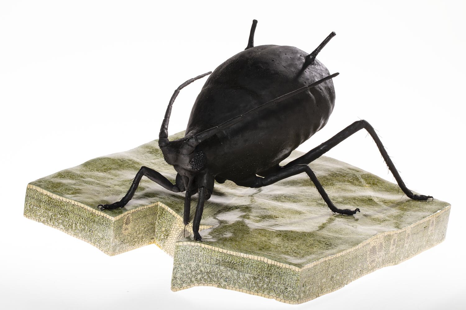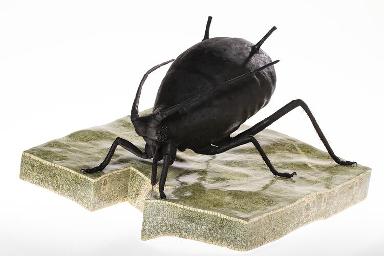 Wax model of a Black Peach Aphis (Anuraphis persicae-niger (aphididae)) magnified x130 made by R. H. Fowler, 15/5/1937. It was made for the Industrial and Technological Museum, along with thousands of other examples of wax models. This collection was used to promote Victoria's horticultural development and to educate the public about horticulture, disease and insect pests.